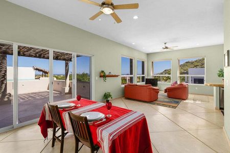 La vida al aire libre es el corazón de Casa Vista Bonita. Múltiples terrazas y patios cubiertos ofrecen áreas sombreadas ideales para disfrutar del clima, incluyendo un refugio en planta baja rodeado por un muro de piedra de río y vegetación nativa. Pero el verdadero protagonista es la terraza en la azotea, un amplio mirador perfecto para disfrutar amaneceres, observar las estrellas o admirar las vistas ininterrumpidas hacia el Mar de Cortés.